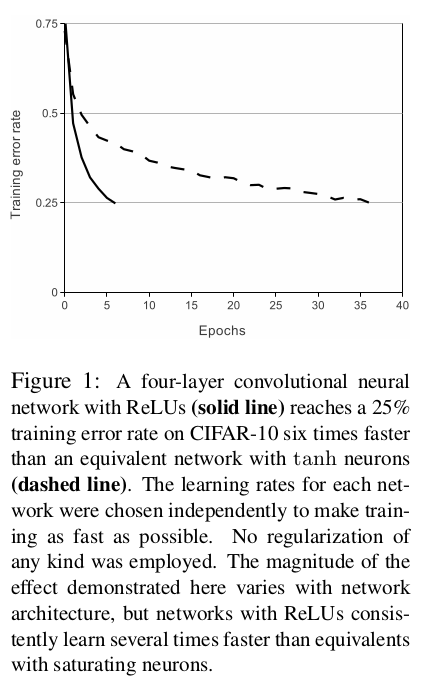 使用4层卷积神经网络训练CIFAR-10数据集,比较达到25%训练误差率的时间,使用ReLU能够比tanh快6倍