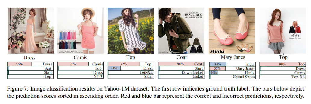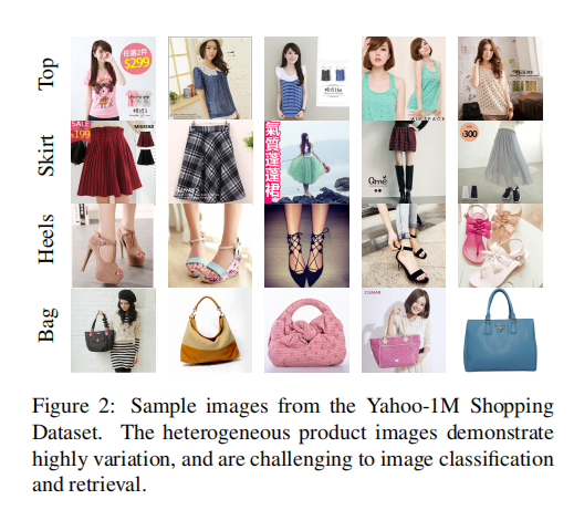 MNIST:包含10类手写数字,从0到9,共有6w张训练图片和1w张测试图片。所有图片均是灰度图片,大小为28x28;CIFAR-10:包含10类目标,每类有6千张图片,共有6w张。其中训练集包含5w张,测试集包含1w张;Yahoo-1M:包含112, 4087张购物产品图片,共有116类服装类别。该数据集是通过对雅虎购物网站上的图像进行抓取来收集的。所有图片被标记为一个类别,比如上衣、连衣裙、裙子等等。如下图2所示