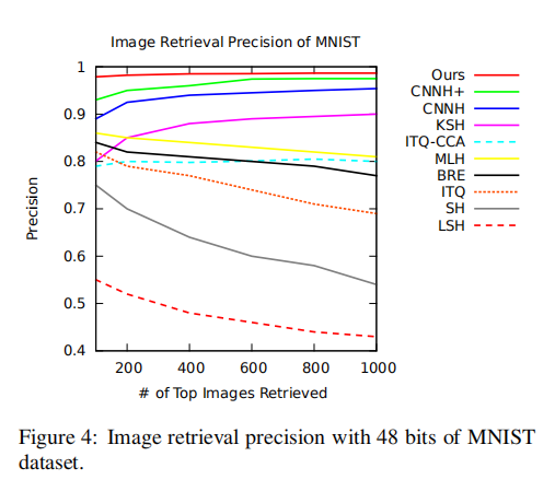 论文使用48个节点隐藏层的模型生成的48位二进制码,使用海明距离度量。随机从测试集中采集了1000张测试图像,对训练集进行图像检索。论文比较了几种最先进的哈希算法,包括有监督的KSH/MLH/BRE/CNNH/CNNH+,以及无监督的LSH/SH/ITQ。