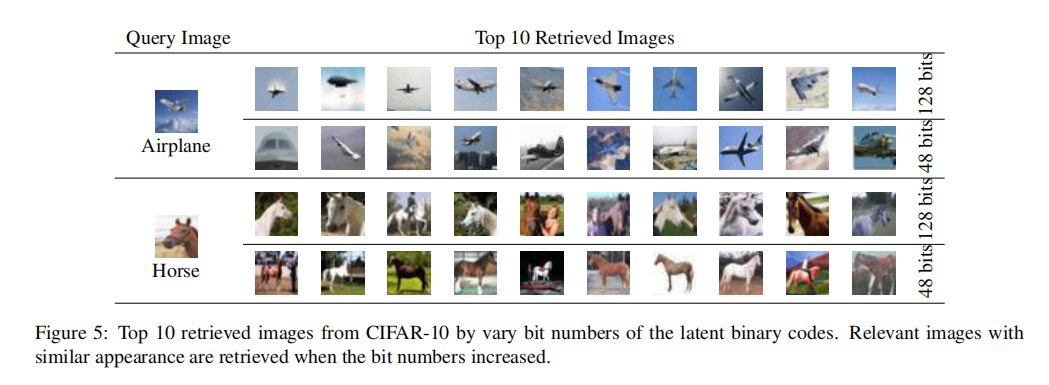 MNIST和CIFAR10数据集上超越了之前最好的方法,在CIFAR10数据集上比之前最好方法提高了30%精度,在MNIST数据集上提高了1%精度; - 提出的算法基于逐点模式进行二进制哈希码学习,相比于之前逐对的方法更容易扩展到更大的数据集。