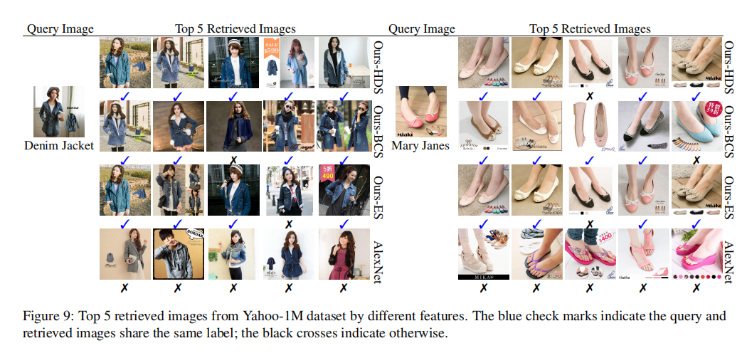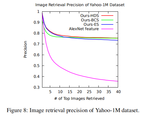 上图6展示了不同算法在不同检索数目情况下的检索精度。论文提出的深度哈希算法在不同检索数目下能够稳定似乎89%检索精度,相比于其他最好的CNNH+,提升了30%精度。