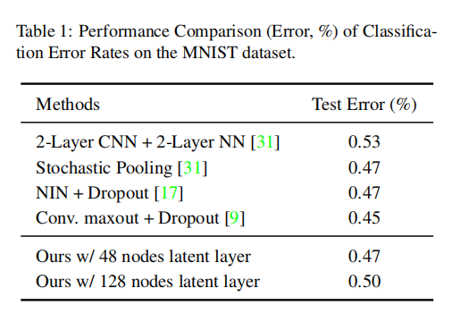 训练设置和MNIST一致,经过5w轮训练后得到89%测试准确率。和其他模型比对如上表2所示,说明在深度CNN模型中嵌入二值隐藏层不会损害模型性能。