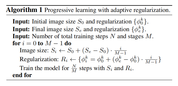 基于上述观察,论文提出渐进式学习算法:在训练早期阶段使用小图像和弱正则化强度(应用在随机失活方法或者数据增强策略上);后期逐步增加图像大小和正则化强度。