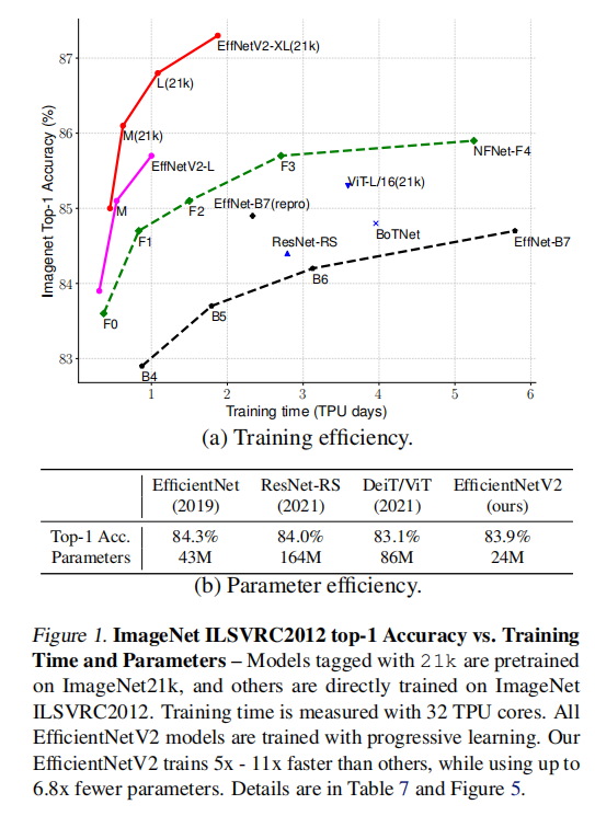 之前的论文大多关注于如何提高准确率、减少模型大小或FLOPS,而随着训练数据集的不断增大,如何提高训练速度也成为了研究热点(在工作中也遇到了这个问题)。论文专注在显著提升训练速度和参数效率这两个研究方向(当然模型准确率也是杠杠的),提出了EfficientNetV2模型簇和渐进式学习算法。