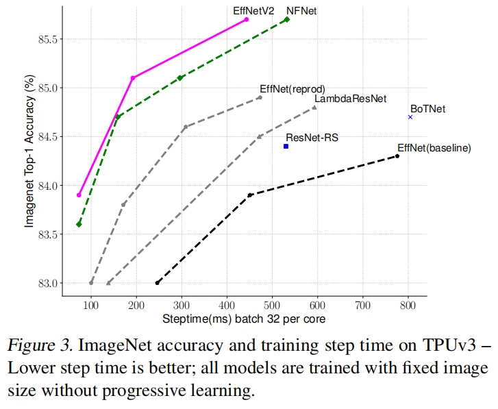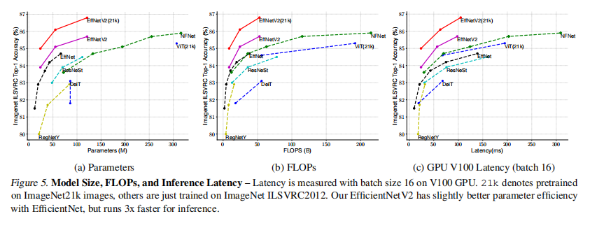EfficientNet通过NAS搜索得到基准架构EfficientNet-B0,然后通过复合放大策略创建更大的模型。虽然最近提出的一些算法在训练或者推理速度上超越了EfficientNet系列,但是在参数数目和FLOPs上往往不如EfficientNet。本文提出的EfficientNetV2在保留参数效率的同时提升了训练速度。