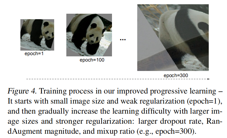 渐近式学习示例如下图4所示,在训练早期阶段使用更小的输入图像和更弱的正则化强度,这样能够保证训练速度更快;然后逐步增加图像大小和正则化强度。