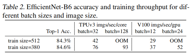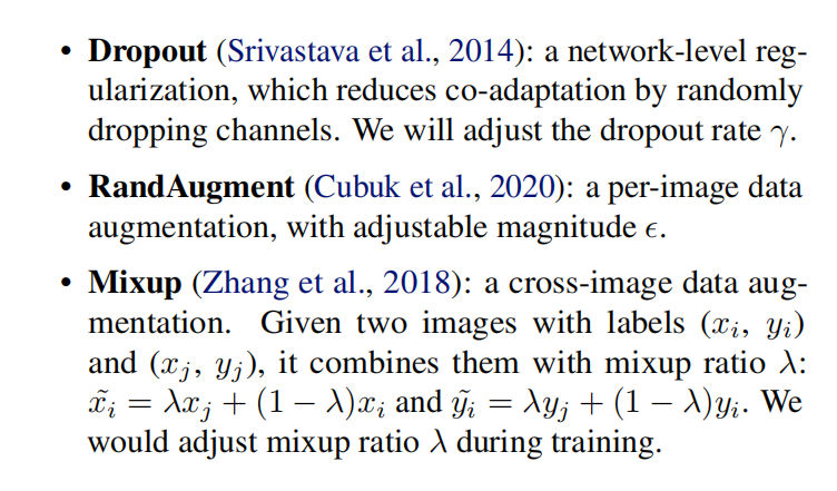 之前已经有网络利用小输入图像进行训练,不过会导致精度衰减。论文分析原因在于对不同图像大小使用了相同的正则化强度:更小的输入图像会导致更小的网络容量,需要弱正则化;反之,更大的输入图像需要强正则化。
