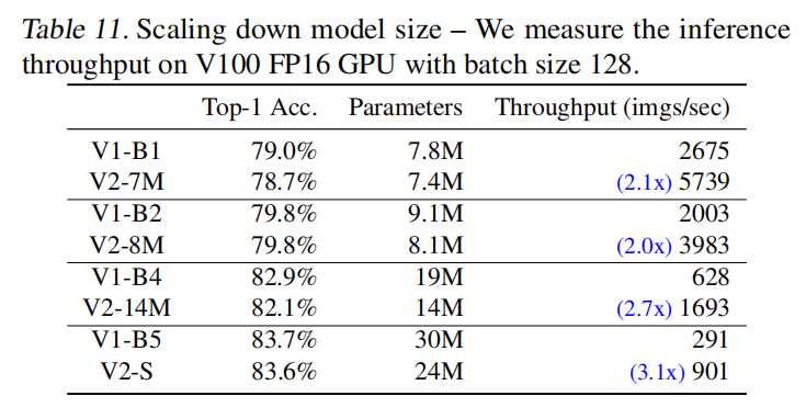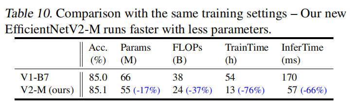 同时,论文基于复合放大策略进行反向缩小,与更小的EfficientNet模型进行比较。如下表所示,在相近的准确率下,V2模型拥有更小的参数量和更快的训练时间。