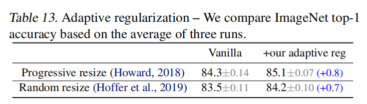 论文的核心观点之一是训练阶段的自适应正则化,即根据图像大小变化动态调整正则化强度。论文比较了另外两种训练设置:一是不改变正则化强度,只是逐步的从小到大的增加图像大小(Training imagenet in 3 hours for 25 minutes);二是在每个批次中随机采样设置不同的图像大小(Mix & match: training convnets with mixed image sizes for improved accuracy, speed and scale resiliency)。训练结果如下表13所示,通过增加自适应正则化强度配置,模型能够得到更好的训练精度。