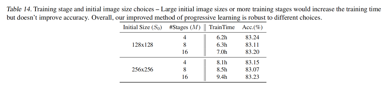论文在不同网络(ResNet/EfficientNet)和不同目标图像大小的情况下应用了渐近式学习,证明了其有效性。如表12所示: