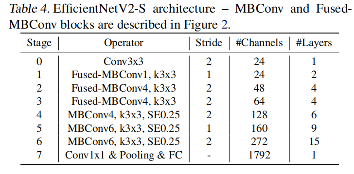 这一次搜索得到的EfficientNetV2-S的参数量和FLOPs大于EfficientNet-B4,但拥有更快的推理和训练时间。其基本架构如下图所示: