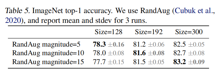 为此论文进行了相关实验,使用不同图像大小和数据增强策略进行训练,如下图表5所示。当输入小尺寸图像,使用弱正则化策略即可实现最好准确率;当输入大尺寸图像,使用更强的正则化策略能够获取更好的准确率。
