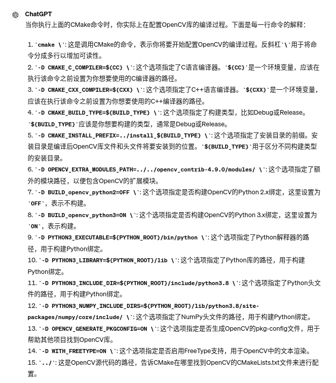 1 2 3 4 5 6 7 8 9 10 11 12 13 14 15 16 17 18 19 20 21 22 23 24 25 26 27 28 29 30 31 32 33 34 35 36 37 38 39 40 41 42 43 44 45 46 47 48 49 50 51 52 53 # !/bin/bash # 设置工具链(可根据需要修改) export CC=gcc export CXX=g++ # 打印系统信息 # 使用 printf 命令打印50个星号 printf '*%.0s' {1..50} echo # 打印换行符 echo "当前系统信息:" echo " - 发行版信息:$(lsb_release -ds)" echo " - 处理器核心数:$(nproc)" echo " - 系统架构:$(uname -m)" # 使用 printf 命令打印50个星号 printf '*%.0s' {1..50} echo # 打印换行符 # 创建并进入build目录 mkdir -p build cd build # 打印当前路径 pwd # 设置编译类型(Debug或Release) # BUILD_TYPE=Debug BUILD_TYPE=Release # 设置为Release则编译Release版本 # 定义Python库根路径变量 PYTHON_ROOT=/home/zj/anaconda3/envs/py38 # 执行CMake编译OpenCV库 cmake \ -D CMAKE_C_COMPILER=${CC} \ -D CMAKE_CXX_COMPILER=${CXX} \ -D CMAKE_BUILD_TYPE=${BUILD_TYPE} \ -D CMAKE_INSTALL_PREFIX=../install_${BUILD_TYPE} \ -D OPENCV_EXTRA_MODULES_PATH=../../opencv_contrib-4.9.0/modules/ \ -D BUILD_opencv_python2=OFF \ -D BUILD_opencv_python3=ON \ -D PYTHON3_EXECUTABLE=${PYTHON_ROOT}/bin/python \ -D PYTHON3_LIBRARY=${PYTHON_ROOT}/lib \ -D PYTHON3_INCLUDE_DIR=${PYTHON_ROOT}/include/python3.8 \ -D PYTHON3_NUMPY_INCLUDE_DIRS=${PYTHON_ROOT}/lib/python3.8/site-packages/numpy/core/include/ \ -D OPENCV_GENERATE_PKGCONFIG=ON \ -D WITH_FREETYPE=ON \ ../ # 编译OpenCV库 make -j$(nproc) # 安装OpenCV库 make install