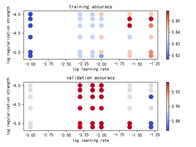 results[(lr, reg)] = (train_acc, val_acc) if best_val < val_acc: best_val = val_acc best_svm = svm