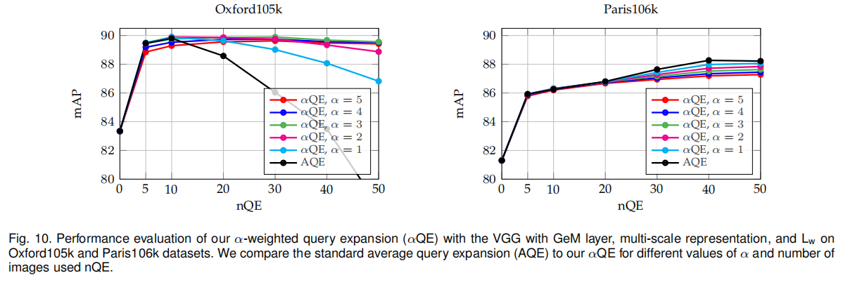 论文还增强了查询扩展算法,在之前的实现中通过求和平均查询图像以及Top-n个排序图像的特征向量,执行L2归一化之后再次排序,论文称之为AQE(average query expansion)。这种实现方式中很难通过调整n的数量来适应不同的数据集。对此论文提出一种泛化模式,为每个初始查询得到的特征向量给予一个权重α-weighted query expansion (αQE))。当αQE等同于AQE。