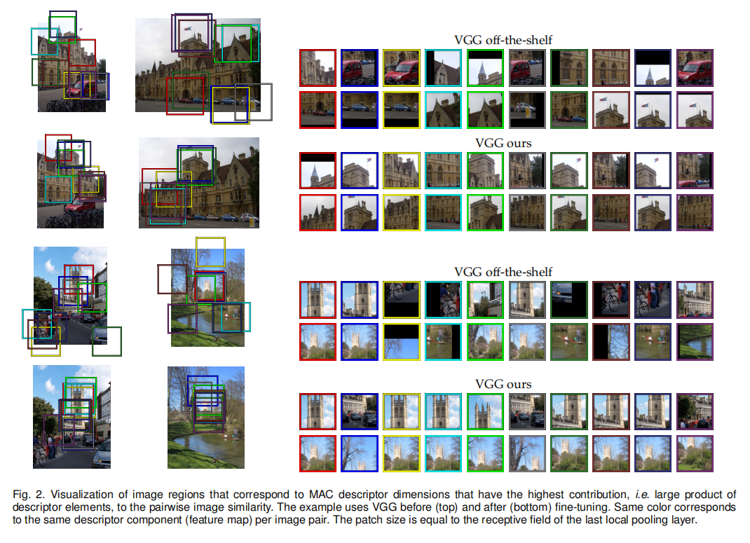 对于MAC向量而言,每个2D特征图生成一个激活值,其等同于一块图像区域。一对MAC向量的计算可以看成是两组图像区域之间的比较,如下图2所示,论文对比了微调前后MAC向量中贡献了最大相似度的区域对,可以发现微调后对于感兴趣目标具有更大的判别力。