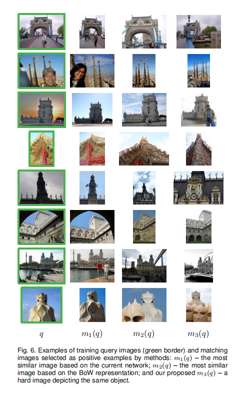 论文在引言中还特别提到Gordo的工作:Deep Image Retrieval: Learning global representations for image search和End-to-end Learning of Deep Visual Representations for Image Retrieval,表明两者最大的差别在于前者论文的重心在于端到端的学习以及RPN的使用(其中也有无监督训练数据的挖掘),而后者的重心在于困难训练数据的挖掘以及新的池化层GeM的使用(从这个角度来说,两位的工作是可以互补的)。