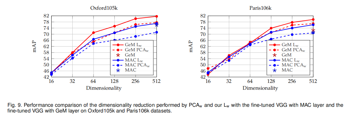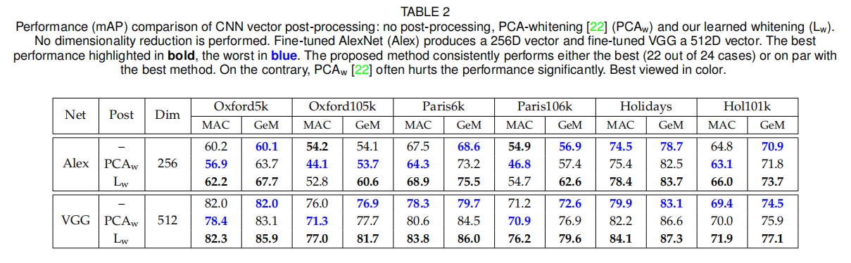 论文主要提到了3个后处理步骤:白化、多尺度描述符以及查询扩展。