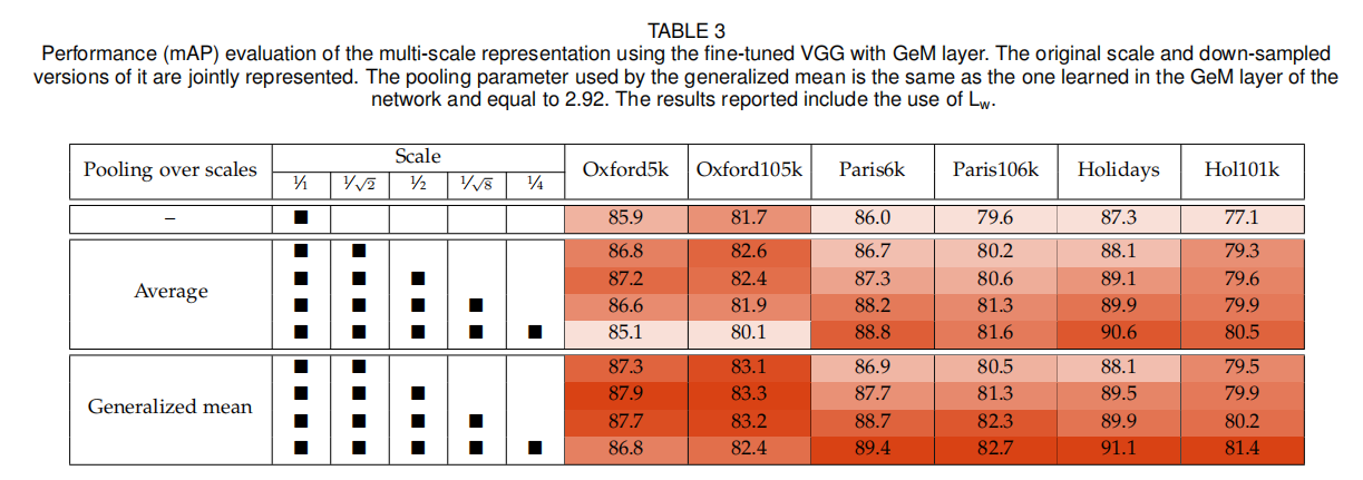 类似于End-to-end Learning of Deep Visual Representations for Image Retrieval,论文也尝试了多尺度描述符,输入不同大小图像,生成GeM描述符之后进行求和,最后执行L2归一化得到最终描述符。通过实验证明了这种方式同样有效并且优于平均池化操作。