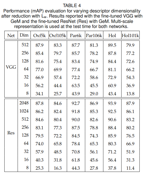 论文在上表三中展示了多尺度描述符的性能,可以观察到多尺度表示能够有效提升检索性能,不论是平均池化还是GeM。论文还在表四展示了不同维度下的多尺度描述符(使用