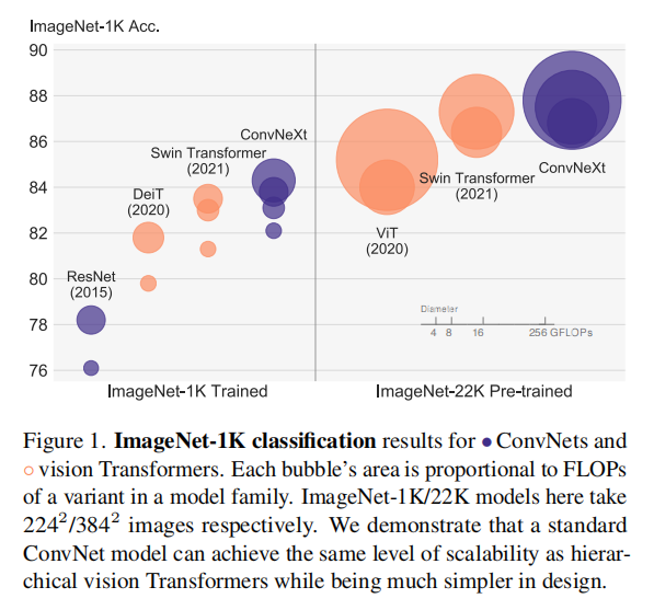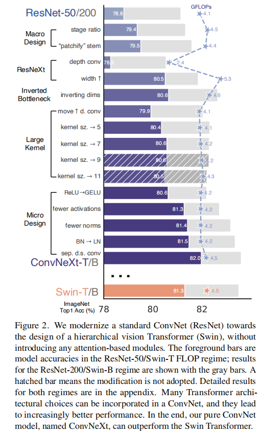 类似于ST站在Transformer角度结合卷积网络的特性实现最好的性能,论文站在卷积网络的角度,通过调研ST的架构设计以及训练方式,并且结合卷积网络发展过程中出现的各种优异组件,逐步将ResNet改造成为类Transformer架构,最后得到一个新的纯卷积网络模型簇 - ConvNeXt。