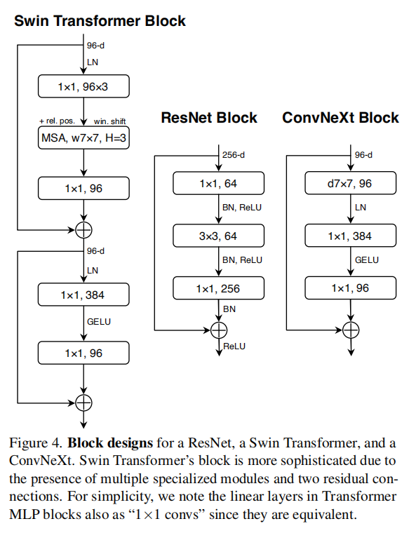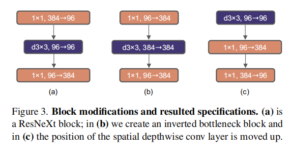 论文参考了Swin Transformer中反向瓶颈层的设计(即中间隐藏层的膨胀维度是输入维度的4倍),对ResNet50的瓶颈层进行调整,如下图3中图(a)和图(b)所示: