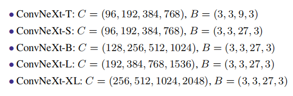 论文构造了网络ConvNeXt-T/S/B/L,它们分别和Swin-T/S/B/L拥有相似的复杂度。其中ConvNeXt-T/B分别是改造ResNet-50/Swin-B和ResNet-200/Swin-T的最终产物。论文还进一步放大得到ConvNeXt-XL。ConvNeXt模型簇仅仅在每个阶段的通道数ResNet和Swin Transformer设计,下一阶段的通道数双倍于上一阶段,详细参数如下图所示