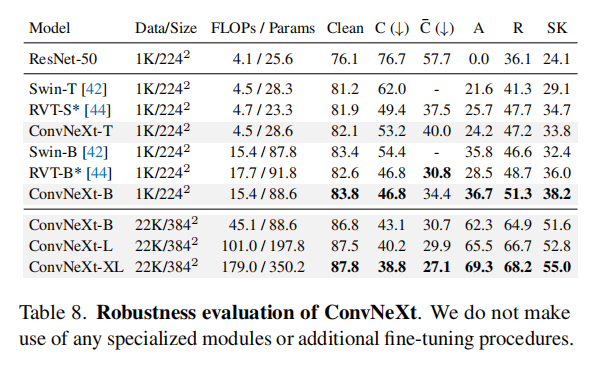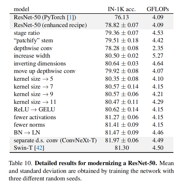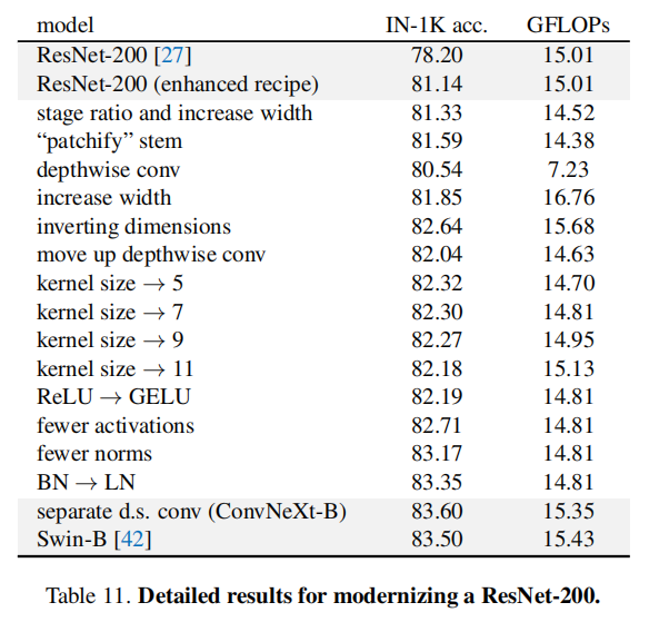 上述修改将ResNet-50改造成为ConvNeXt-T。它和Swin-T相比,拥有近似相同的FLOPs、参数量、吞吐性能和内存占用。每一步调整的FLOPs和准确率变化如下表10所示