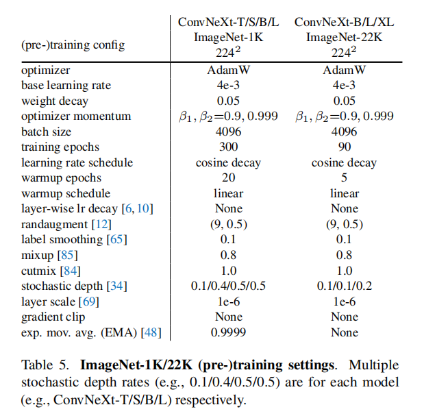 ConvNeXt基准模型之前该找过程中均采用这个训练配置(除了禁止EMA,因为实验发现它会损害BN层训练); ConvNeXt模型簇的训练均采用这个配置(除了随机深度比率(stochastic depth rate)会基于变体自定义)。