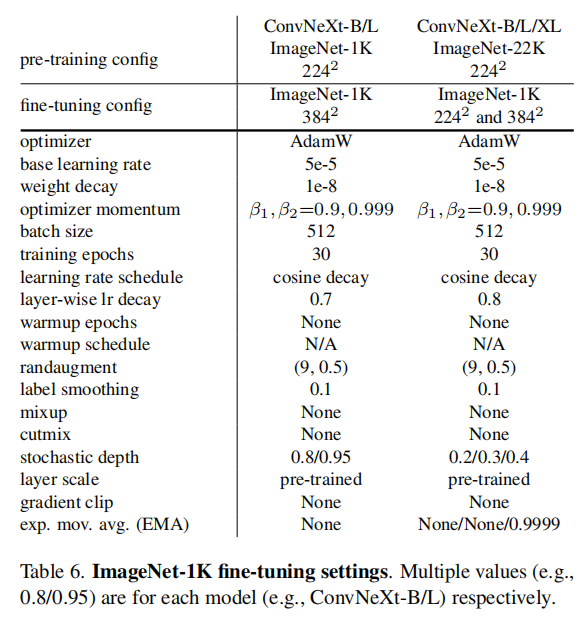 论文观察到即使预训练阶段EMA(直接训练ImageNet-1K或者ImageNet-22K)被使用了,微调使用EMA并不会导致性能提升(除了ConvNeXt-L,使用在ImageNet-1K上的预训练模型进行微调,如果不使用EMA,性能显著下降)。