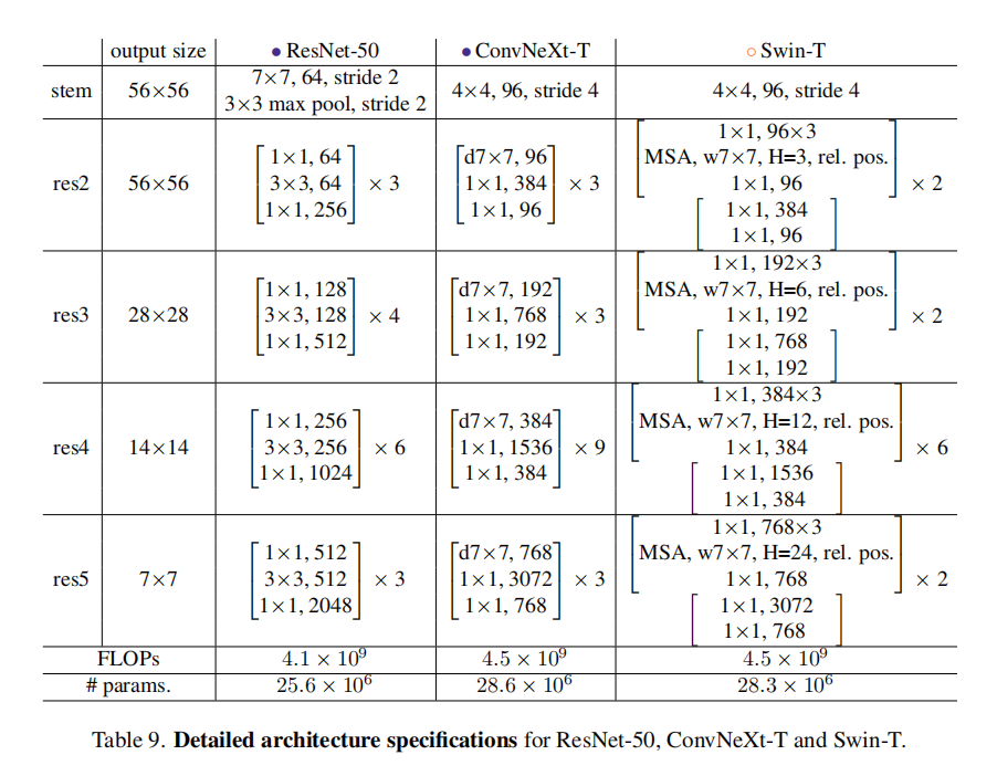 对于ResNet-200而言,每个阶段的块数目为(3, 24, 36, 3),遵循Swin-B的(3, 3, 27, 3)设置。这种调整动态减少了FLOPs,为了保持相近的计算量,将宽度从64提升至84;在采用深度卷积之后,进一步提升至128。