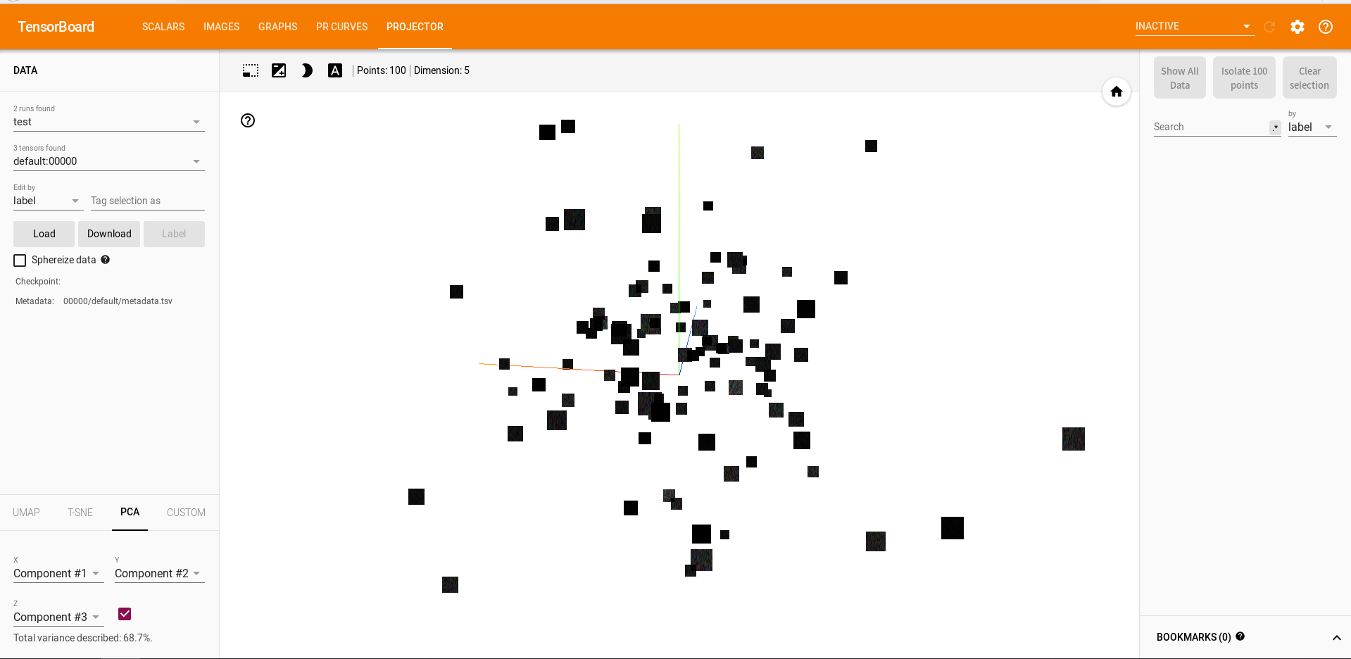 完成上述操作后,在tensorboard页面菜单栏选择PROJECTOR标签,将高维数据投影到3维空间中
