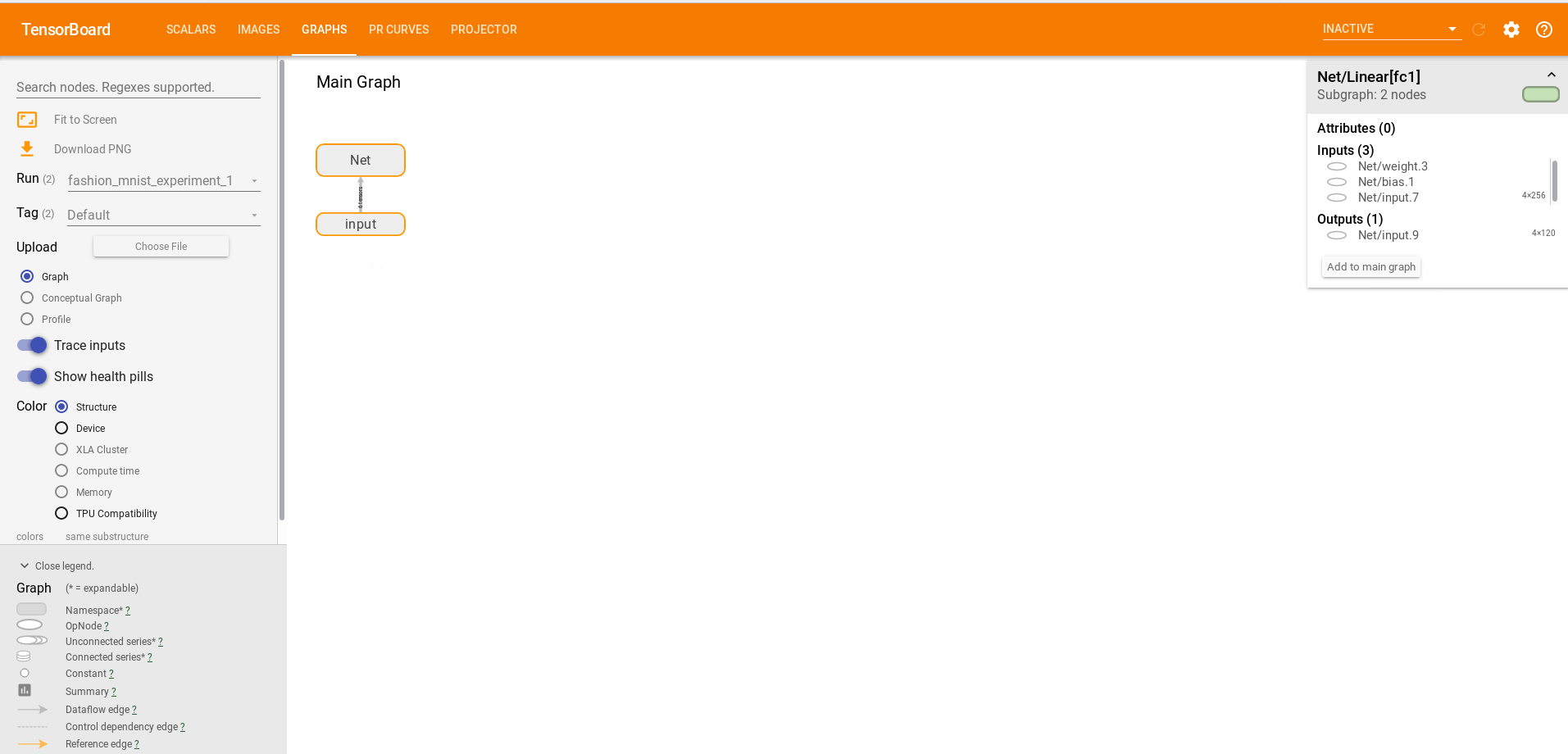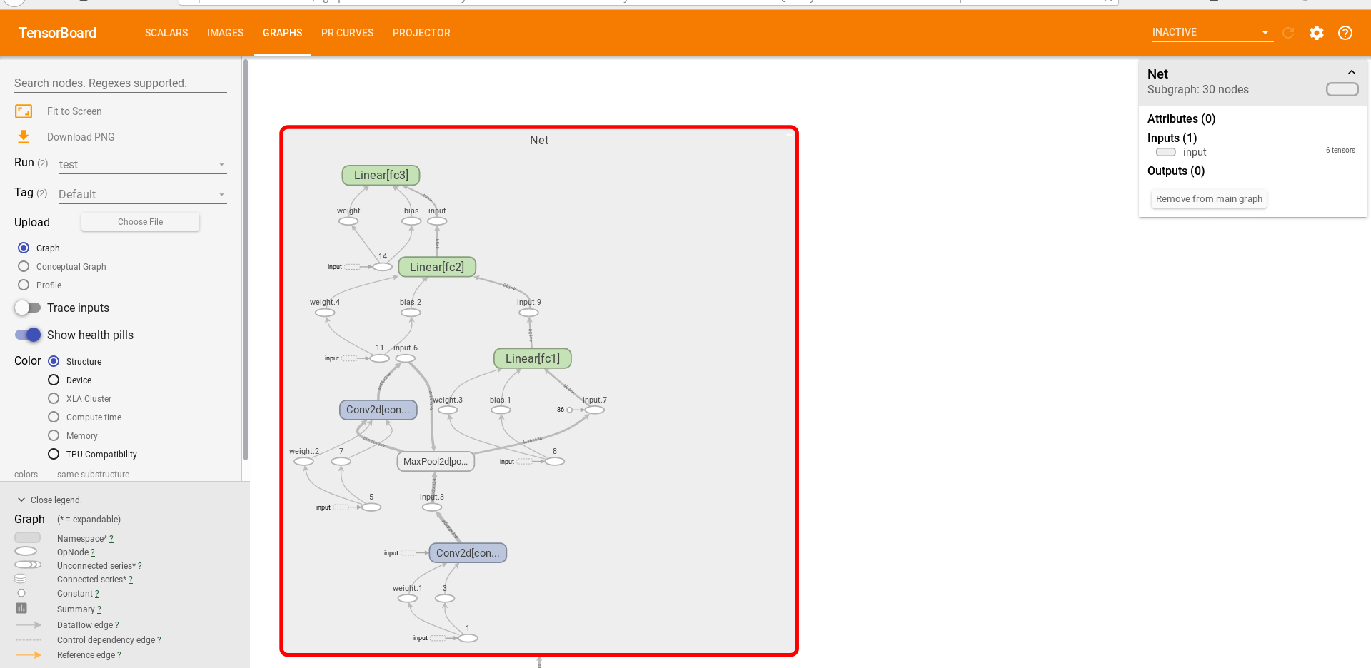 1 2 3 4 5 6 7 8 9 10 11 12 13 14 15 16 17 18 19 20 21 22 23 24 25 26 27 28 29 30 31 32 33 34 35 36 37 38 39 40 41 42 43 44 45 46 47 48 49 50 51 52 53 54 55 56 57 58 59 60 61 62 63 64 65 66 import torch.nn as nn import torch.nn.functional as F import torchvision import torchvision.transforms as transforms # 定义模型 class Net(nn.Module): def __init__(self): super(Net, self).__init__() self.conv1 = nn.Conv2d(1, 6, 5) self.pool = nn.MaxPool2d(2, 2) self.conv2 = nn.Conv2d(6, 16, 5) self.fc1 = nn.Linear(16 * 4 * 4, 120) self.fc2 = nn.Linear(120, 84) self.fc3 = nn.Linear(84, 10) def forward(self, x): x = self.pool(F.relu(self.conv1(x))) x = self.pool(F.relu(self.conv2(x))) x = x.view(-1, 16 * 4 * 4) x = F.relu(self.fc1(x)) x = F.relu(self.fc2(x)) x = self.fc3(x) return x net = Net() print(net) # 获取数据 # transforms transform = transforms.Compose( [transforms.ToTensor(), transforms.Normalize((0.5,), (0.5,))]) # datasets trainset = torchvision.datasets.FashionMNIST('./data', download=True, train=True, transform=transform) testset = torchvision.datasets.FashionMNIST('./data', download=True, train=False, transform=transform) # dataloaders trainloader = torch.utils.data.DataLoader(trainset, batch_size=4, shuffle=True, num_workers=2) testloader = torch.utils.data.DataLoader(testset, batch_size=4, shuffle=False, num_workers=2) # constant for classes classes = ('T-shirt/top', 'Trouser', 'Pullover', 'Dress', 'Coat', 'Sandal', 'Shirt', 'Sneaker', 'Bag', 'Ankle Boot') # get some random training images dataiter = iter(trainloader) images, labels = dataiter.next() print(images.size()) ## 写入模型 writer.add_graph(net, input_to_model=images,verbose=True) writer.close()