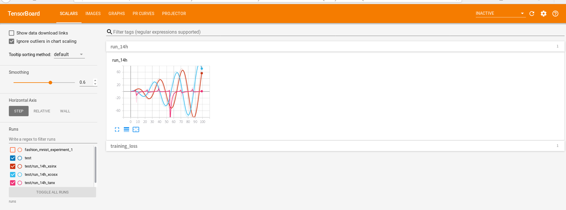1 2 3 4 5 6 7 8 r = 5 for i in range(100): writer.add_scalars('run_14h', {'xsinx':i*np.sin(i/r), 'xcosx':i*np.cos(i/r), 'tanx': np.tan(i/r)}, i) writer.close() # This call adds three values to the same scalar plot with the tag # 'run_14h' in TensorBoard's scalar section.