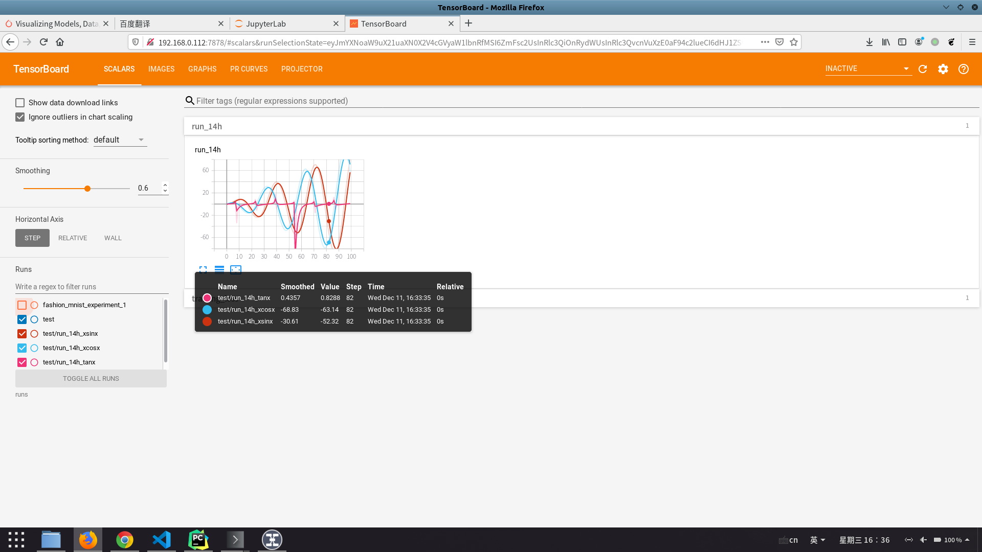 1 2 3 4 5 $ tensorboard --logdir=runs --host=192.168.0.112 --port=7878 TensorFlow installation not found - running with reduced feature set. W1211 15:14:25.693824 140379677206272 plugin_event_accumulator.py:294] Found more than one graph event per run, or there was a metagraph containing a graph_def, as well as one or more graph events. Overwriting the graph with the newest event. W1211 15:14:25.694132 140379677206272 plugin_event_accumulator.py:322] Found more than one "run metadata" event with tag step1. Overwriting it with the newest event. TensorBoard 2.0.0 at http://192.168.0.112:7878/ (Press CTRL+C to quit)