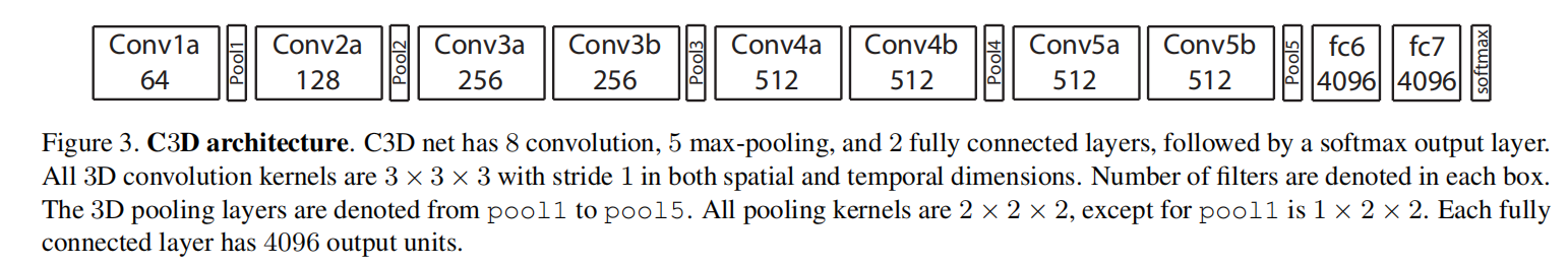 C3D拥有8个卷积层和5个池化层,跟随两个全连接层以及一个softmax输出层。整体网络架构如上图所示,其中