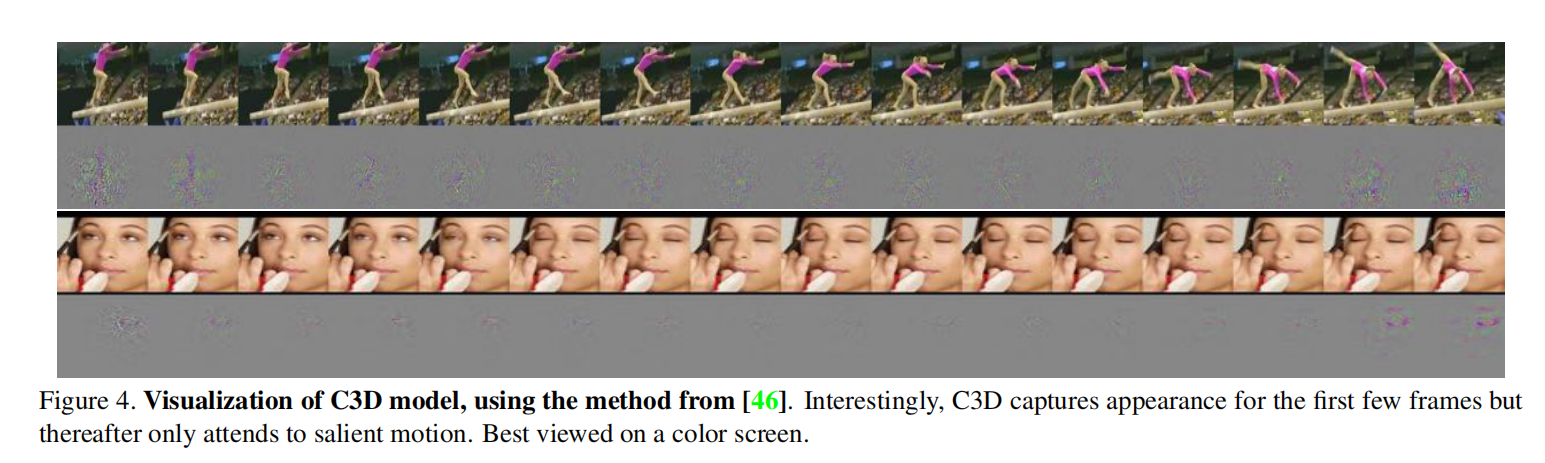 论文观察到C3D首先关注前几帧中的外观,然后跟踪随后几帧中的显著变化。通过反卷积方式,将conv5b两个特征图的最高激活投影回图像,可视化了C3D学习的内容