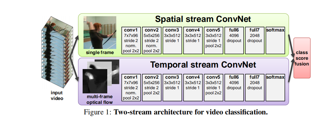 双流网络的提出受到双流假说的影响:人类视觉皮层包含两条通路:腹侧流(执行目标识别)和背侧流(执行运动识别)
