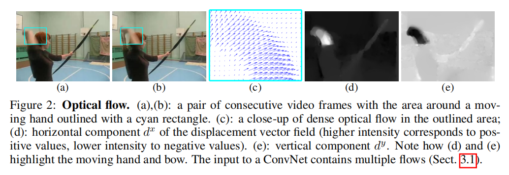 optical flow stacking):密集光流可以看成是连续帧和 之间的一组位置矢量场 ,其中 表示帧 的点 上的位移向量,由两部分组成: 和 ,可以看成是图像的两个通道。在论文中,堆叠了 对连续帧的光流通道 得到 个输入通道,所以其输入卷 中任意一帧 的计算公式如下: