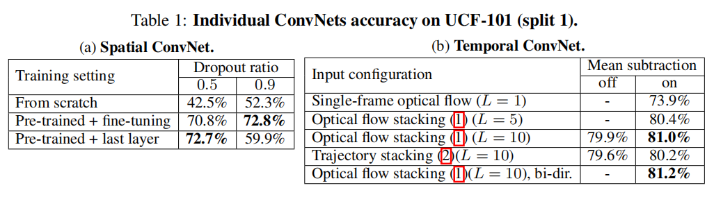 从图中可知,时间网络和空间网络都能够实现比较好的分类性能。其实对于空间网络而言,其输入为连续多帧,天然的包含了运动属性;而对于时间网络而言,每帧光流场图像也包含了目标的静态信息
