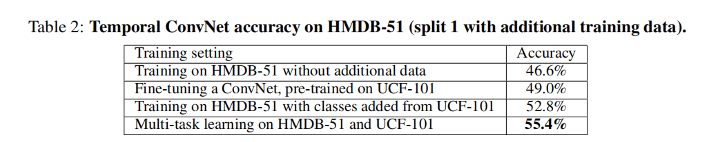 论文使用了UCF101和HMDB51数据集进行测试,这两个数据集的视频个数不多,所以本文提出结合两个数据集进行测试的方法。简单来说,就是为每个数据集设置一个分类器,其余网络层参数保持不变