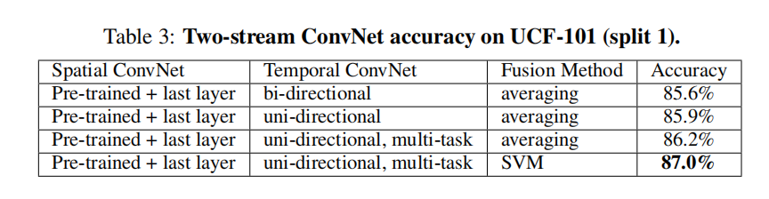 然后介绍了不同融合方法对于双流网络的影响,如下图所示