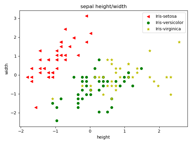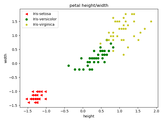 draw_iris(x_train[:, :2], y_train, 'sepal height/width', 'height', 'width') draw_iris(x_train[:, 2:], y_train, 'petal height/width', 'height', 'width')